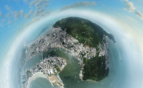 登高而望,可同时看到两轮背对的海湾